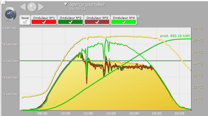 A la première visite, nous avons mis en service le dispositif de télésurveillance qui ne fonctionnait pas. Sans attendre, nous avons pris en main l’installation et procédé à une plusieurs correctifs. Outre l’intervention d’entretien général, des défaillance ont été constatées, la plus importante étant l’absence d’alimentation des ventilateurs de trois onduleurs.