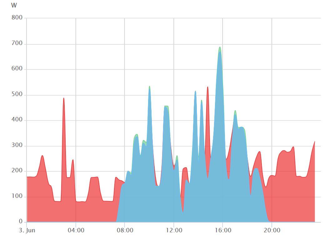 Même si vous avez déjà une chaudière gaz, fioul ou bois, vous pouvez associer un cumulus en série pour chauffer votre eau sanitaire. La consigne est évidemment en premier lieu d’absorber par votre production votre consommation courante. Dès lors que votre production est excédentaire, le régulateur de votre cumulus est autorisé à stocker cette énergie en chauffant l’eau dès le premier watt et jusqu’à 3 kW. Votre courbe d’autoconsommation (bleu) se rapproche alors au plus près de votre production (vert) optimisant ainsi le facteur d’autoconsommation.Capture3